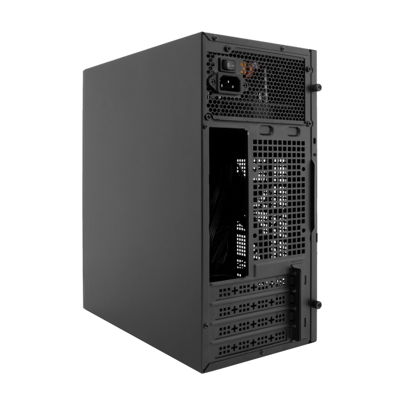 Chasis Micro ATX de color negro fabricado en acero SGCC de 0.8mm con frontal de ABS. Disponible sin fuente de alimentación o con modelo BASIC500GR. Incluye bahías para discos de 3.5” y 2.5” y dispone de puertos USB 3.0 y USB 2.0 frontales, con conector combo HD-Audio. Compatible con ventiladores traseros de 90mm, admite coolers de CPU de hasta 130mm. Cuenta con 4 slots de expansión y medidas de 160 x 350 x 310 mm. Seguridad con soporte para candado y cierre Kesington. Peso: 2.59 kg.